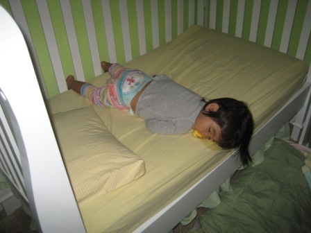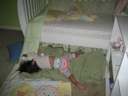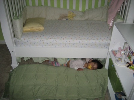 Just last week, dada took one side off my crib. I fell out a few times but I slept through the fall. Now I can get out of bed when I want to. I don’t have to wait for mama or dada to come get me. And in the middle of the night, if I don’t feel like staying in bed, I just scream and walk over to Mama and Dada’s room and see what how they react. Most of the time I get escorted back to bed.